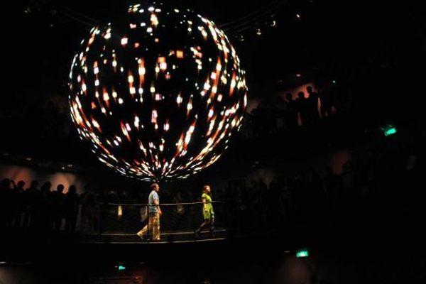 例如,在澳門新濠天地一個展廳中,設計師設計了一個360度立體動感的、聲光電技術結合的表演《龍騰》,其實就是一個環幕全景式電影展示,通過一個故事性的描述“龍的誕生與追尋”,體驗360度影像技術帶來的巨大視聽震撼。這種表現方式具有打破時空局限的較強表現力,能令參觀者產生極強的身臨其境的參與感。